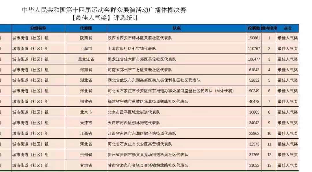 8月22日,第十四届全运会群众赛事活动展演项目启动仪式在西安曲江国际会议中心举行。据悉,第十四届全运会群众赛事活动展演项目分为广场舞、广播体操、健身气功、太极拳4个大项,采取上传视频线上参赛,通过决赛进行线下评审最终选出各类奖项。广播体操设个人赛、三人赛、团体赛三个分项,线下参赛队伍242支、运动员1318名。中华人民共和国第十四届全运会广播体操比赛落下帷幕。陕西省在疫情防控的严峻形势下,组织严密,热情周到,迎接来自全国各地的运动员、教练员、裁判员,经过七天八场的严格评审。我校体育部教师闫勇江所在团队获得全国人气第一名,总成绩一等奖。